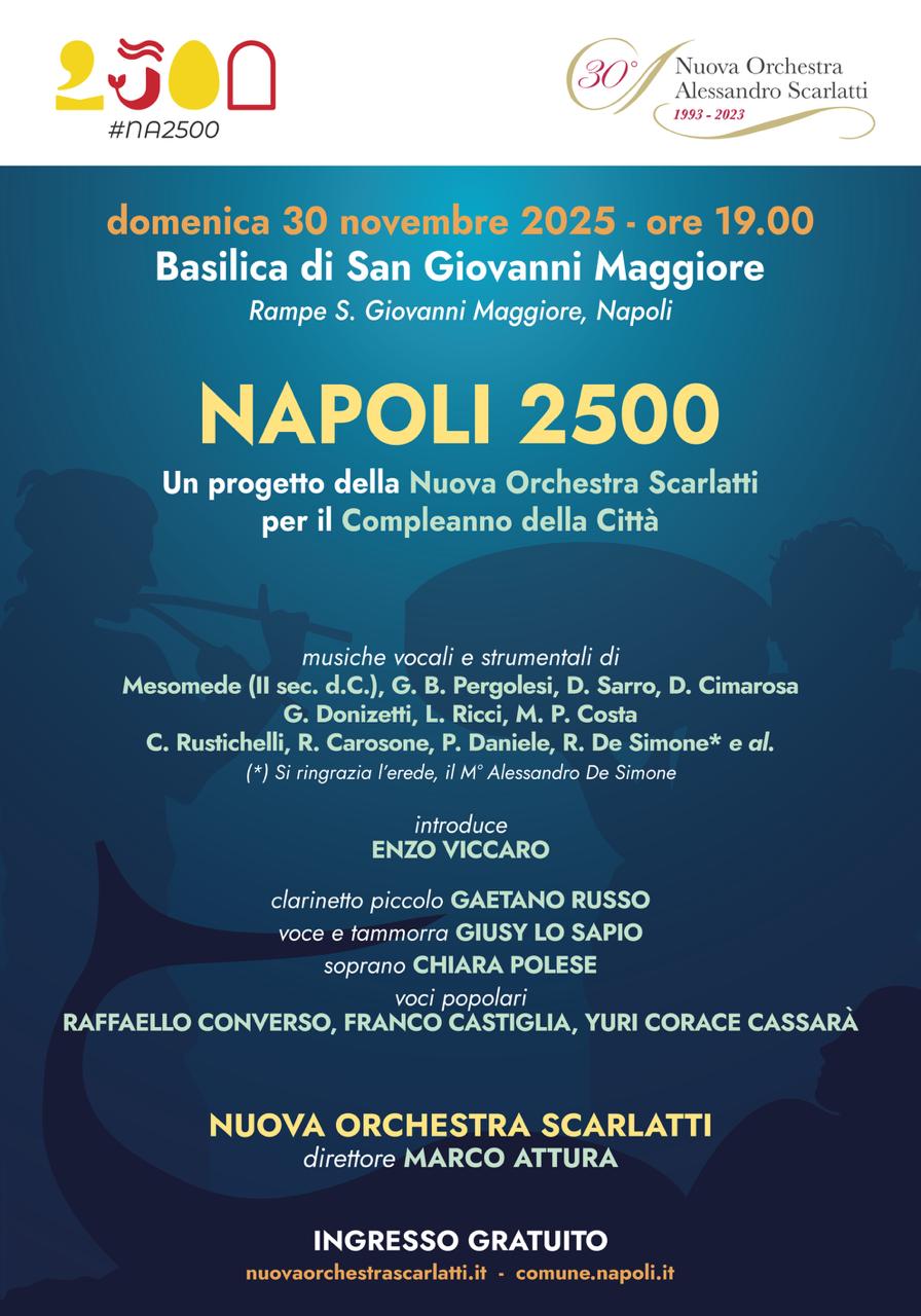 Domenica  30 novembre 2025, alle ore 19.00 nella monumentale cornice della Basilica di San Giovanni Maggiore (Napoli, Rampe di San Giovanni Maggiore – Mezzocannone) si terrà l’evento musicale a ingresso libero Napoli 2500, realizzato dalla Nuova Orchestra Scarlatti nell’ambito dell’omonimo progetto nell’ambito delle celebrazioni dei 2500 anni dalla nascita delle nostra città.