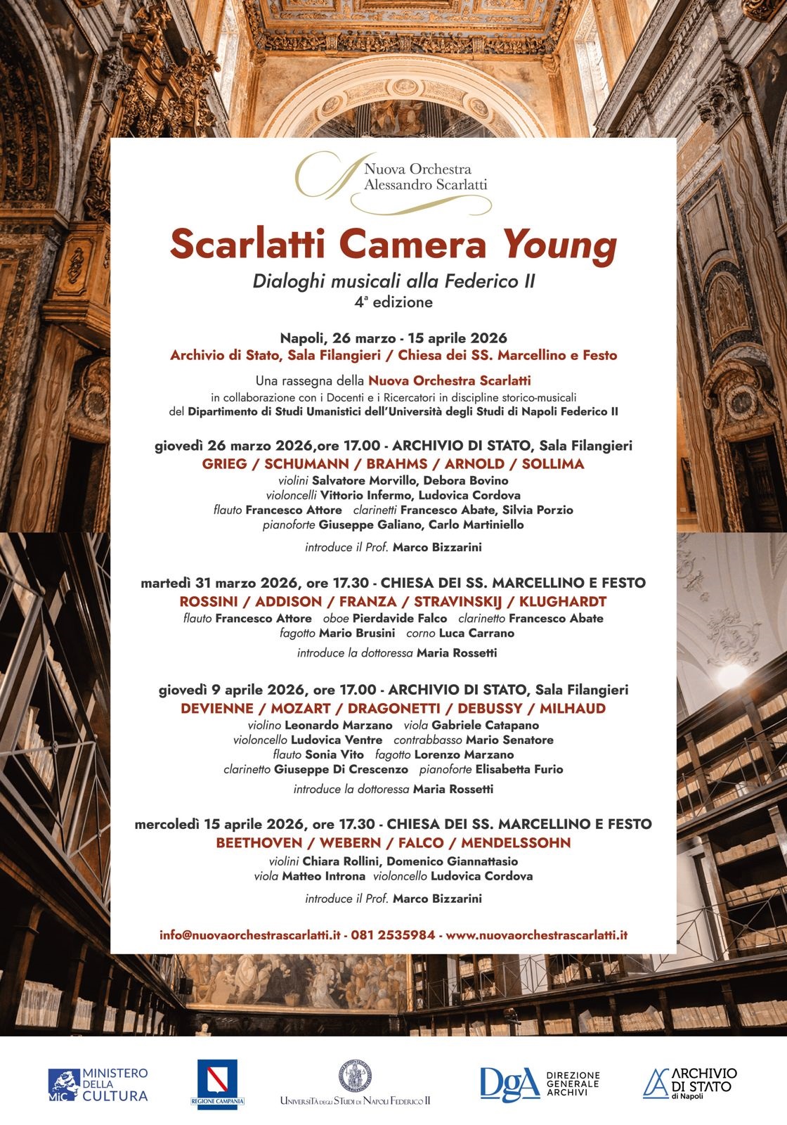 La rassegna prevede quattro appuntamenti dal 26 marzo al 15 aprile 2026, divisi fra la Sala Filangieri dell’Archivio di Stato di Napoli (26 marzo e 9 aprile, ore 17.00) e la Chiesa dei SS. Marcellino e Festo di Napoli (31 marzo e 15 aprile, ore 17.30), con percorsi cameristici proposti ed eseguiti da giovani strumentisti, gran parte dei quali cresciuti nelle file delle Orchestre Scarlatti Junior e Young, e arricchiti dalle presentazioni del professor Marco Bizzarini e della dottoressa Maria Rossetti, musicologi della Federico II.