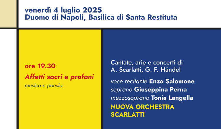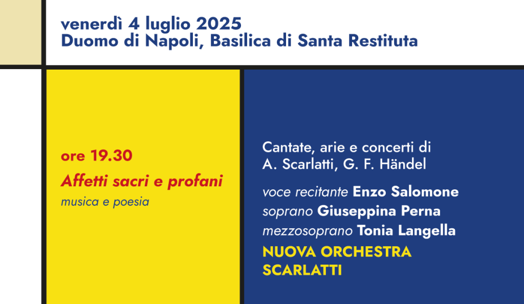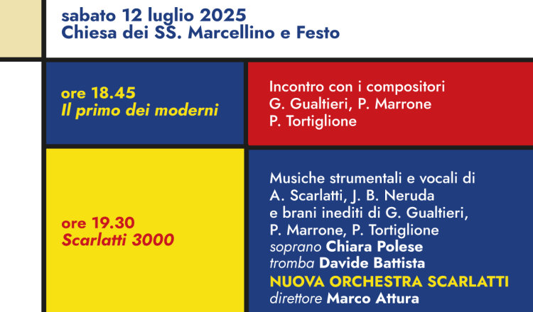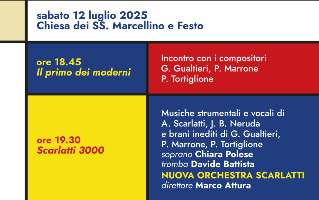 Leggi di piùALESSANDRO SCARLATTI IL PRIMO DEI MODERNI Un progetto della Nuova Orchestra Scarlatti per i 300 anni dalla morte di Alessandro Scarlatti sostenuto dal MIC IV appuntamento venerdì 25 luglio 2025 Napoli – Chiesa dei SS. Marcellino e Festo In a Scarlatti Mood Transizioni orchestrali dal Barocco al Jazz ore 18.45 Barocco Jazz […]