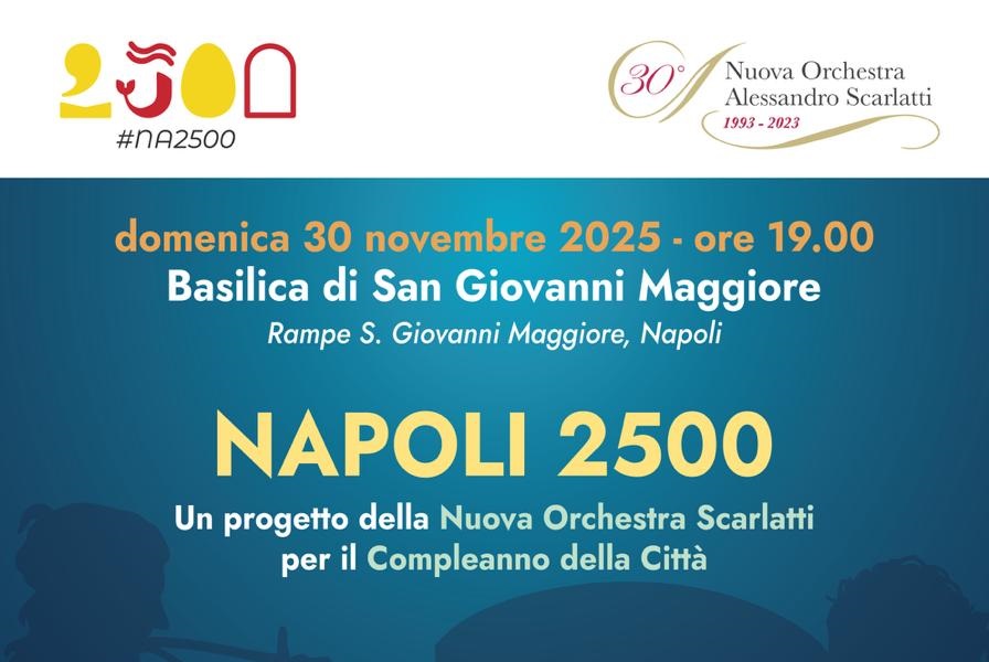 Leggi di piùNapoli – Basilica di San Giovanni Maggiore domenica 30 novembre 2025 – ore 19.00 Napoli 2500 dai Greci a Pino Daniele e Roberto De Simone Un evento della Nuova Orchestra Scarlatti nell’ambito delle celebrazioni per i 2500 anni della città Un mix suggestivo di antico e moderno, classico e popolare, per tutti. […]